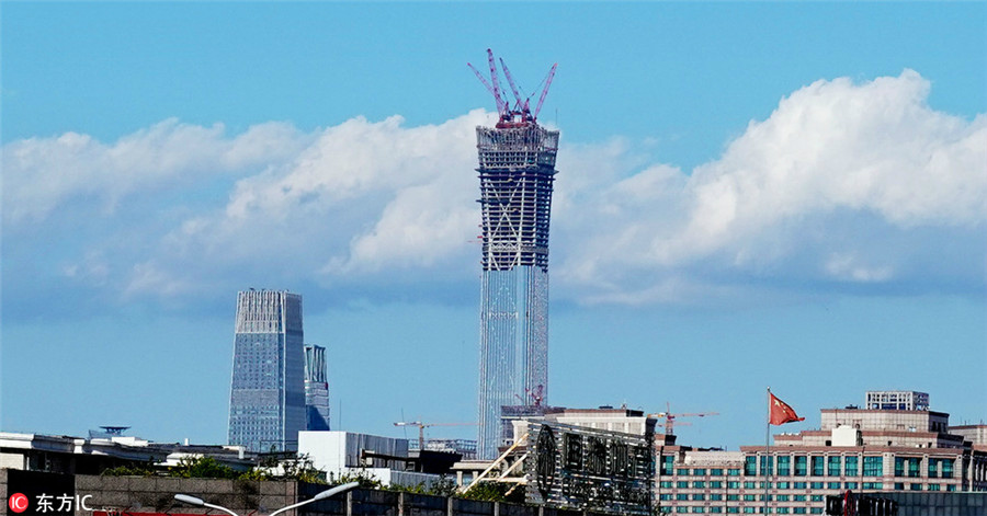 A view of China Zun tower under the blue sky and white clouds in Beijing, August 23, 2017. [Photo/IC]