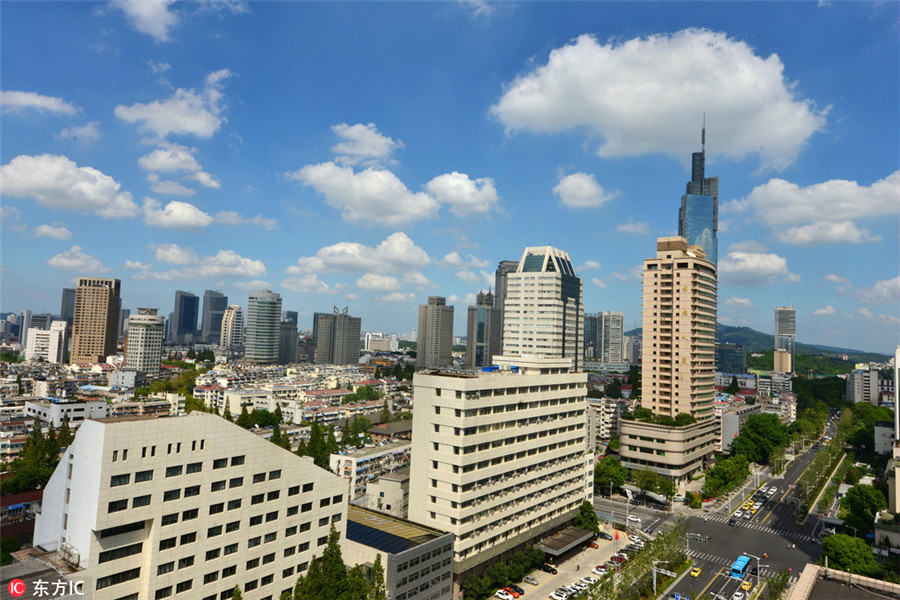 A view of the high-rises in downtown Nanjing city under clear sky, August 23, 2017. [Photo/IC]