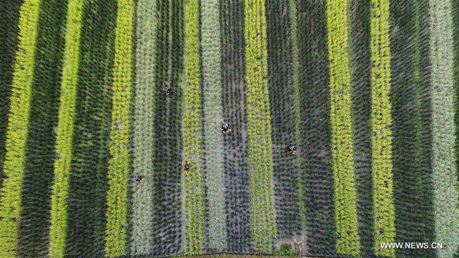 Farmers of Miao ethnic group work in paddy-fields in Yangfang Village of Taijiang County, southwest China's Guizhou Province, Aug. 24, 2017. (Xinhua/Yang Ying)