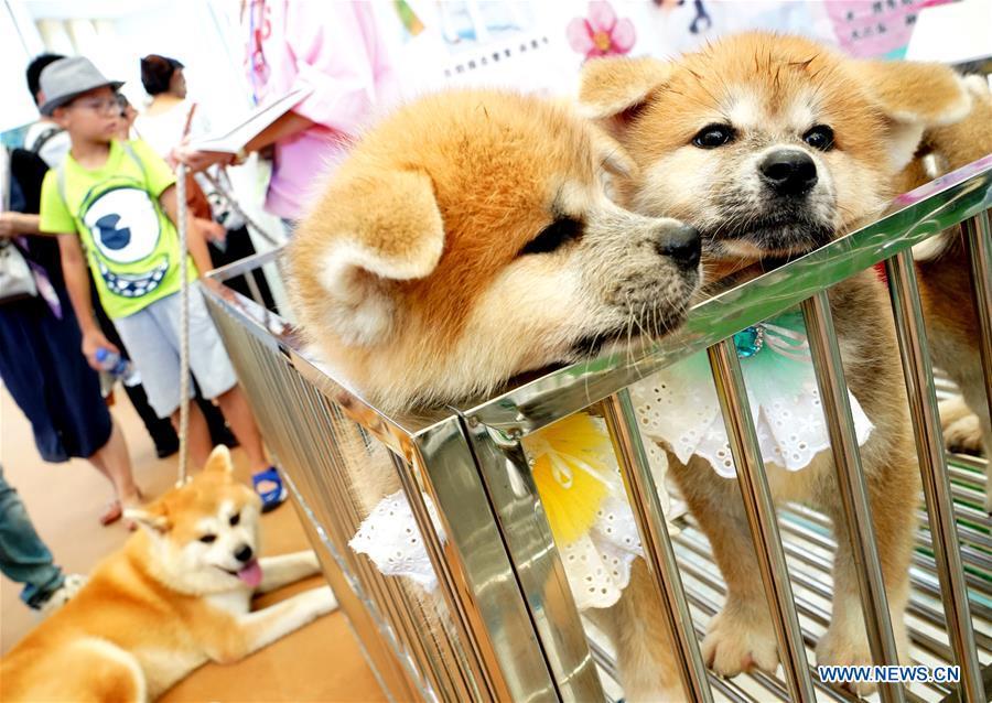 Akita dogs are seen at the Pet Fair Asia 2017 in Shanghai, east China's Shanghai Municipality, Aug. 24, 2017. The Pet Fair Asia 2017 kicked off at Shanghai New International Expo Center Thursday, with 950 exhibitors from around the world participating. (Xinhua/Chen Fei)