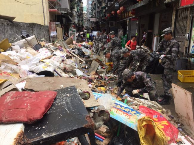 Soldiers of the People's Liberation Army (PLA) Macao Garrison join disaster relief in Macao after typhoon Hato struck the special administrative region on Friday, August 25, 2017. [Photo: China Plus]