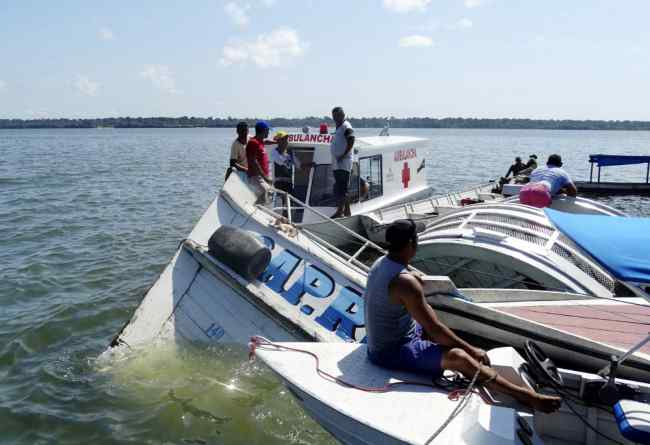 People surround the boat "Comandante Ribeiro" that sank while carrying 70 people during a search and rescue mission in the Xingu River, Para state, Brazil, Aug. 23, 2017. [Photo: AP]