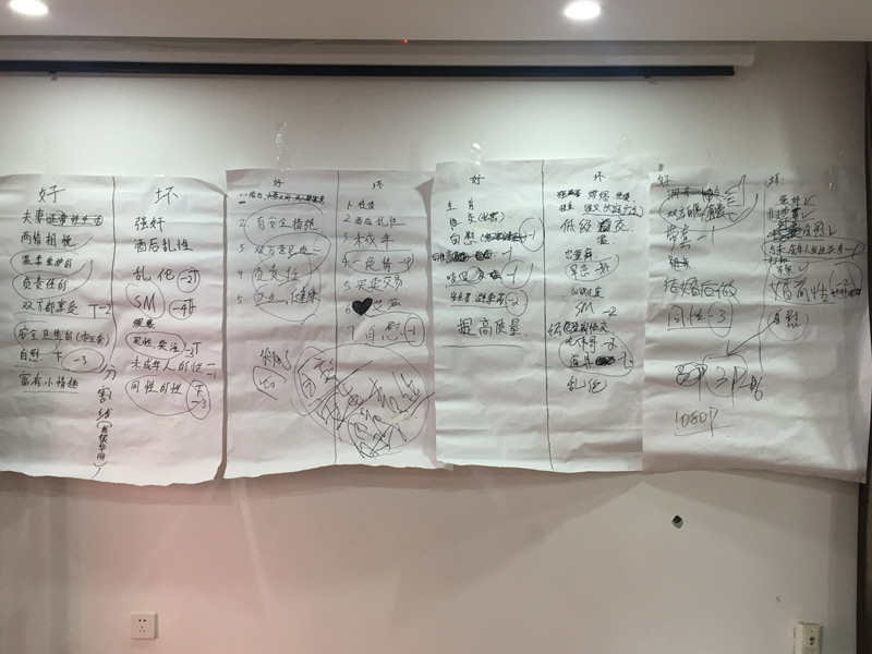 Fang then chose a more obscure way to encourage his students to discuss the good sex-bad sex question, asking them to team up and write down their answers on a large sheet of paper.