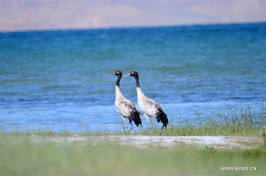 Black-necked cranes are seen in a marshland in Ali of southwest China's Tibet Autonomous Region, Aug. 26, 2017. Ali, an almost virgin land on the Qinghai-Tibet plateau, is home for large variety of wild animals. (Xinhua/Lian Xinming)