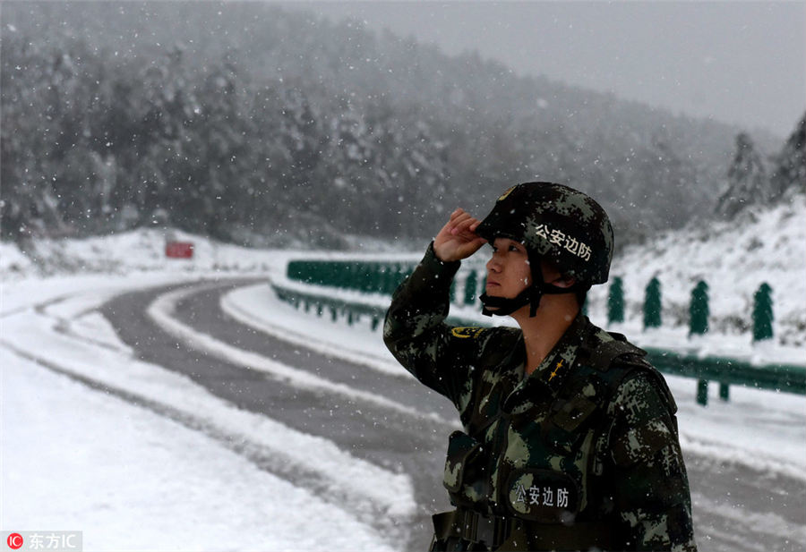 A border policeman patrols along the snow-covered road in Mohe county, Northeast China's Heilongjiang province, August 28, 2017. [Photo/IC]