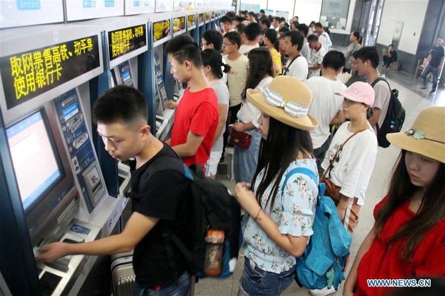 Passengers take tickets from the ticket vending machines at Suzhou Railway Station in Suzhou City, east China's Jiangsu Province, Aug. 31, 2017. China's summer transport peak period ran from July 1 to Aug. 31, when students on summer vacation had time to travel or return home. (Xinhua/Wang Jiankang)