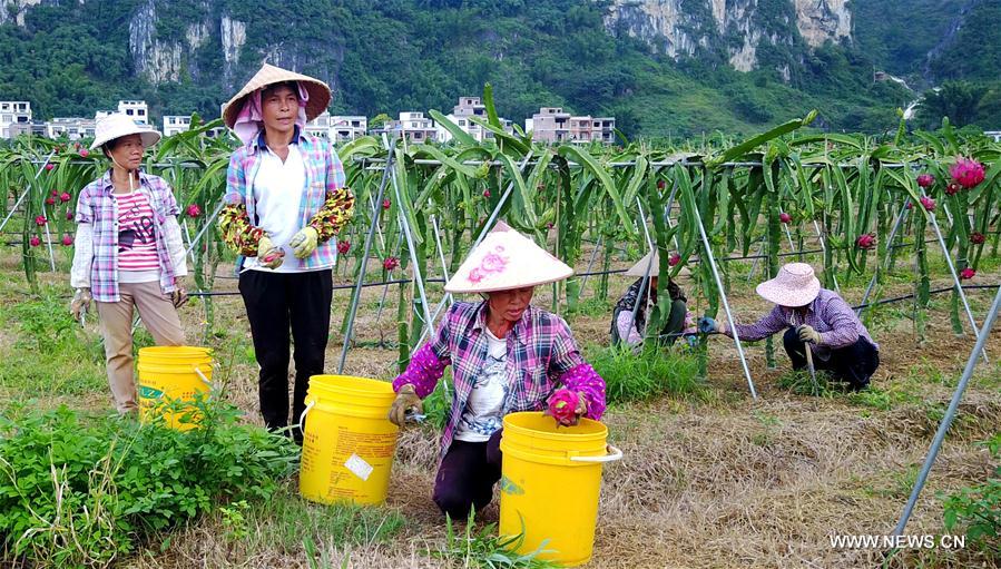 Farmers pluck dragon fruits in Napo Town of Tianyang County, Baise City of south China's Guangxi Zhuang Autonomous Region, Aug. 31, 2017. A group of 23 families are expecting their increased income as they tied a new partnership with a fruit enterprise 3 years ago as share holders. (Xinhua/Zhang Ailin)