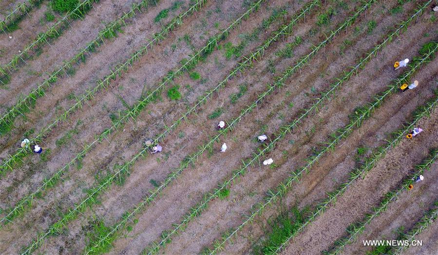 Farmers clean dragon fruit field in Napo Town of Tianyang County, Baise City of south China's Guangxi Zhuang Autonomous Region, Aug. 31, 2017. A group of 23 families are expecting their increased income as they tied a new partnership with a fruit enterprise 3 years ago as share holders. (Xinhua/Zhang Ailin)