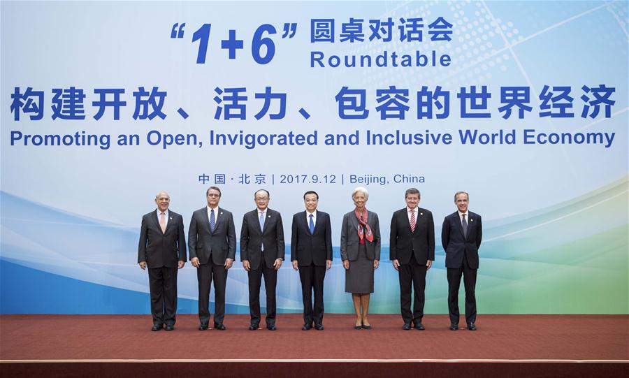 China's Premier Li Keqiang and heads of major international economic institutions pose for pictures before the "1+6" Roundtable Meeting in Beijing, capital of China, Sept. 12, 2017. Li, together with World Bank Group (WBG) President Jim Yong Kim, International Monetary Fund (IMF) Managing Director Christine Lagarde, World Trade Organization (WTO) Director-General Roberto Azevedo, International Labor Organization (ILO) Director-General Guy Ryder, Organization for Economic Cooperation and Development (OECD) Secretary-General Angel Gurria and Financial Stability Board (FSB) Chairman Mark Carney, held the Second "1+6" Roundtable here on Tuesday. (Xinhua/Li Tao)
