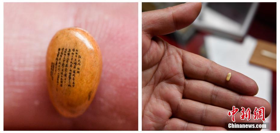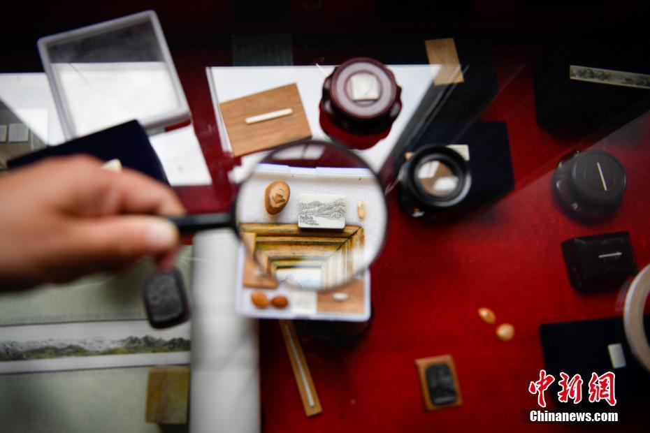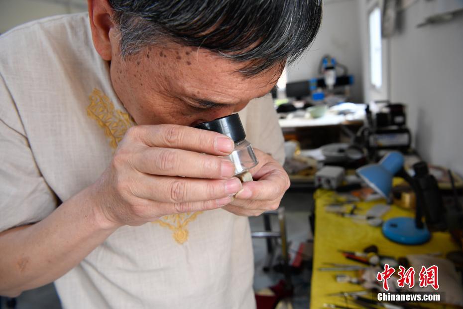 Ran Longquan, a master of microscopic carving, scrutinizes his works at his studio in Kunming, southwestern China’s Yunnan province. The master, born into a carpenter family, is 60 years old. Since the 1980s, he has been carving on miniature items, such as a grain of rice, a peepal tree seed, and even a strand of hair. His pieces of art have now been collected by Japan and Singapore.