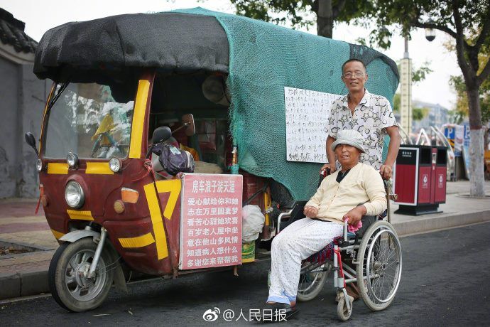 Guo Jingxin’s wife suffered a cerebral hemorrhage seven years ago and remained in a coma for 13 months after surgery. After she woke up from coma, Guo decided to take her across the country and made a “van” from a three-wheeler.