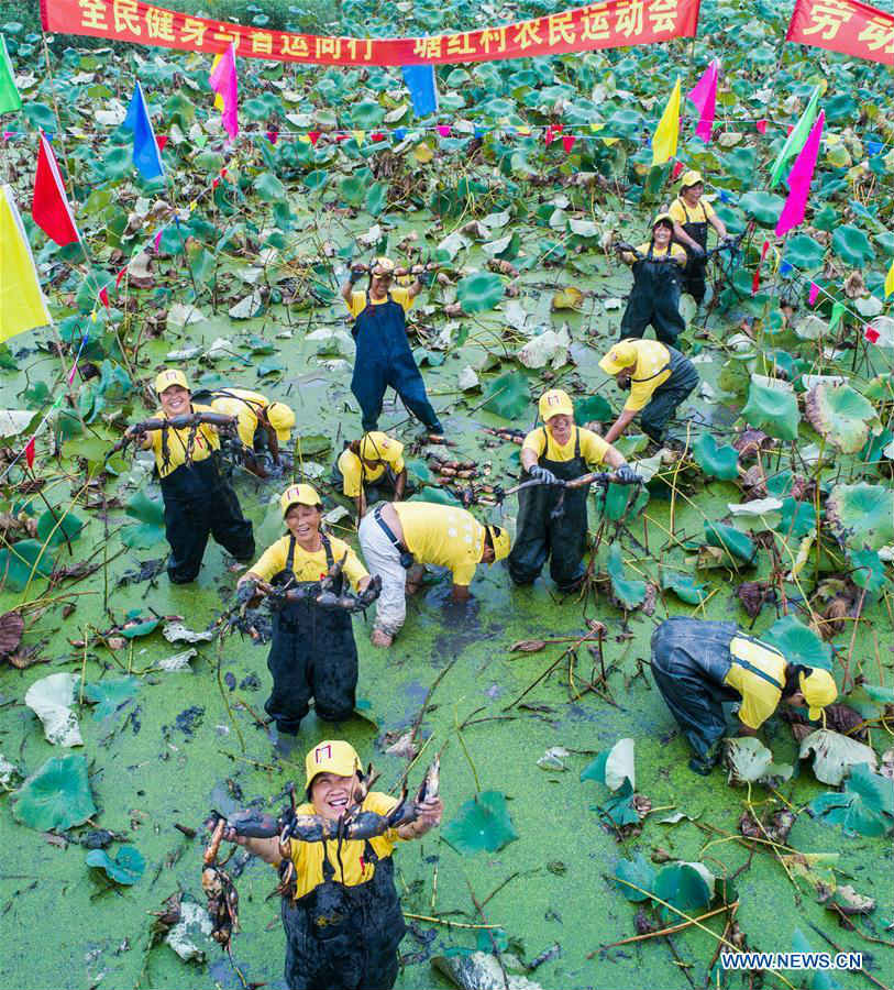Villagers take part in a digging lotus roots match in Tanghong Village, Huzhou City, east China's Zhejiang Province, Sept. 24, 2017. Local people held a match here Sunday to celebrate the harvest of lotus roots. (Xinhua/Xu Yu)