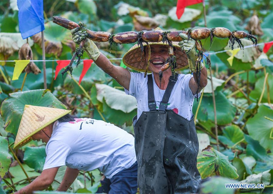 A villager shows lotus roots during a digging lotus roots match in Tanghong Village, Huzhou City, east China's Zhejiang Province, Sept. 24, 2017. Local people held a match here Sunday to celebrate the harvest of lotus roots. (Xinhua/Xu Yu)