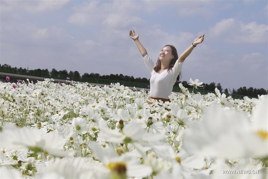 A tourist poses for photos among flowers in Guanyun County, east China's Jiangsu Province, Oct. 8, 2017. (Xinhua/Wu Chenguang)