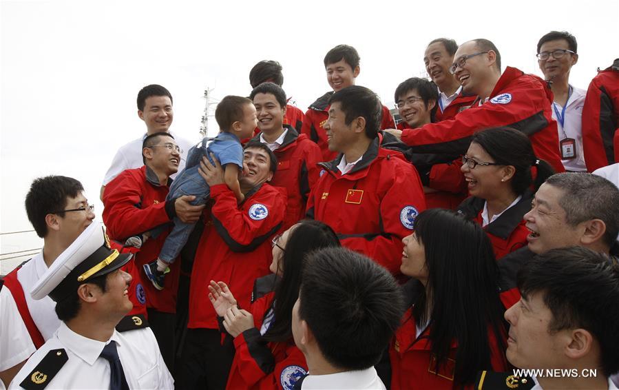 Shi Xing'an (2nd R, rear), a member of the Chinese scientific expedition team, is welcomed by his son upon his return in Shanghai, east China, Oct. 10, 2017. China's ice breaker, the Xuelong (Snow Dragon) returned to base in Shanghai Tuesday after 83 days on the Arctic rim, completing its eighth Arctic expedition. (Xinhua/Fang Zhe)