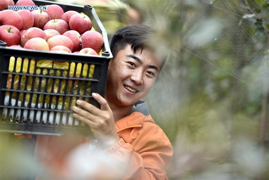 A staff member harvests apples in Dancheng County, east China's Shandong Province, Oct. 10, 2017. (Xinhua/Fang Dehua)