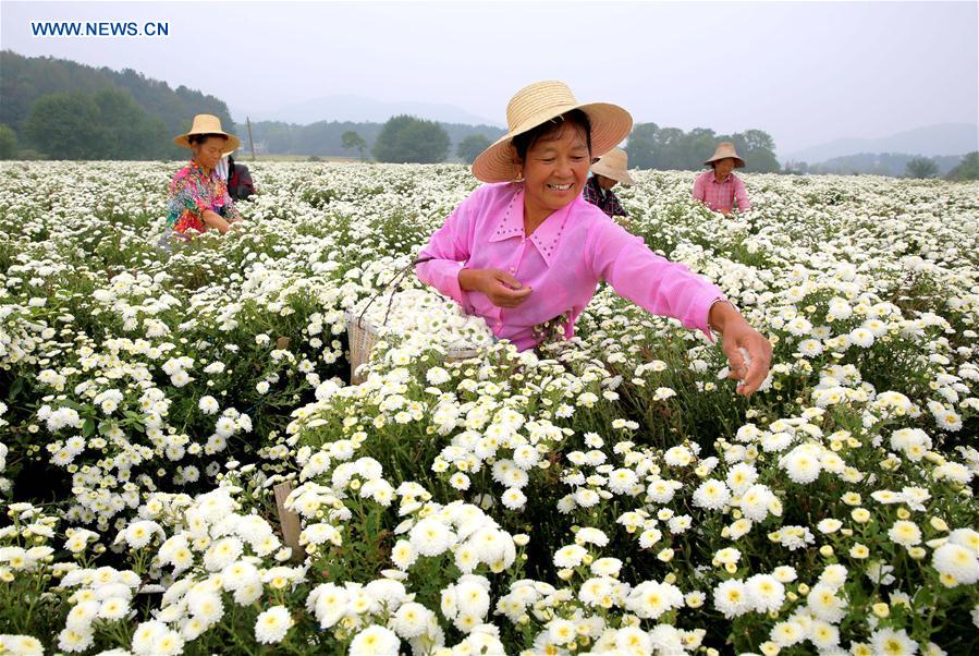 Farmers harvest chrysanthemum in Huaining County, east China's Anhui Province, Oct. 10, 2017. (Xinhua/Jiang Sheng)