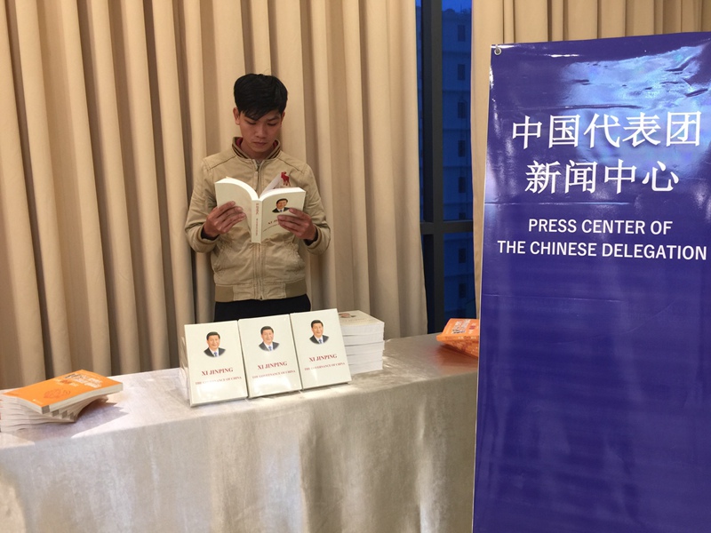 Chinese President Xi Jinping’s book “The Governance of China” in both Chinese and Vietnamese is displayed at the press center.