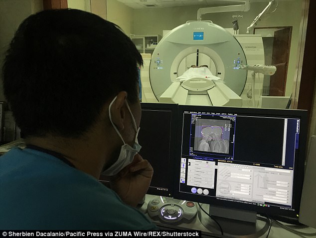 A medic examines scans of the twins ahead of the risky operation to separate them. (Photo from Mail Online)