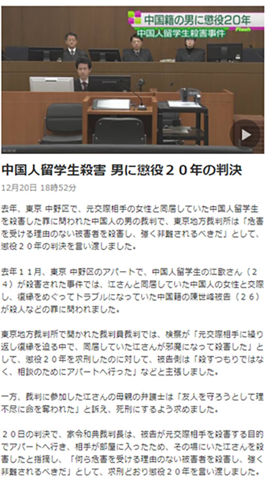 Chen Shifeng, the murderer, also an overseas Chinese student, was sentenced to 20 years' imprisonment a year after he stabbed and killed Jiang at the doorstep of her Tokyo apartment.