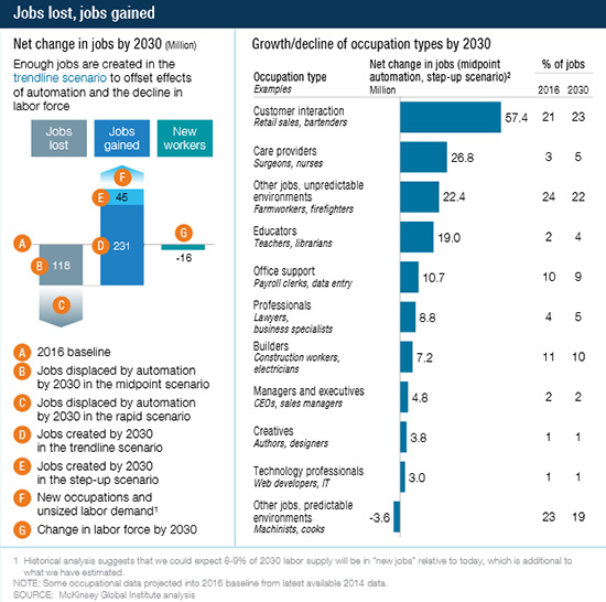 Fortunately, employment opportunities will exist to offset the impact of automation and the decline of the nation’s workforce. According to the report, machinists and cooks will see a drop in employment opportunities.