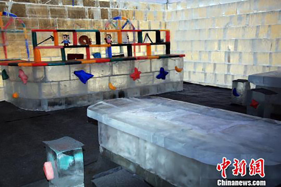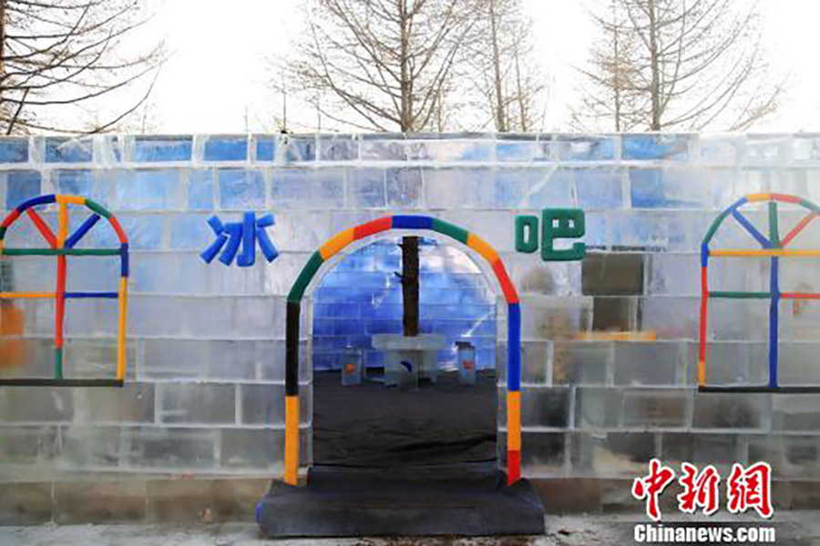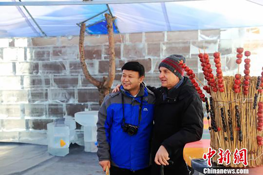 It was built with nearly 1,000 blocks of ice, and covers an area of 300 square meters, in which tourists can eat sugar-coated haws on a stick, enjoy hot drinks, and take photos with the ice sculptures.