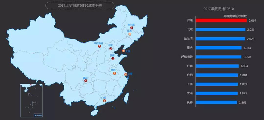 Hangzhou, the headquarters of world-known e-commerce platform Alibaba, has slipped out of the top 10 list. Suqian, the hometown of its opponent JD.com, has the second highest jump in traffic congestion.