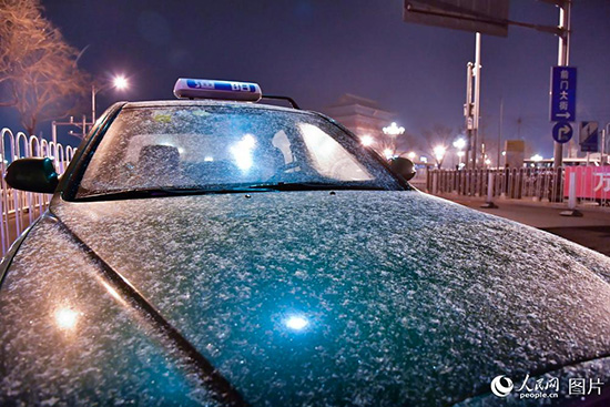 From 7 pm last night to 6 am this morning, the average snowfall across Beijing is 0.1 millimeters, with the northwestern area getting 0.5mm, the southwestern area getting 0.2mm, the northeastern area getting 0.1mm, and a slight snowfall in urban districts and the southeastern area, according to the monitoring stations. No snow cover was found in most areas at 6 am on Monday morning.