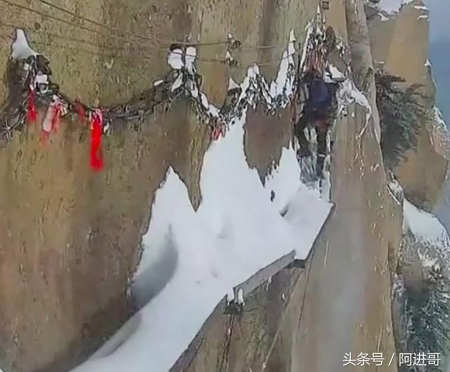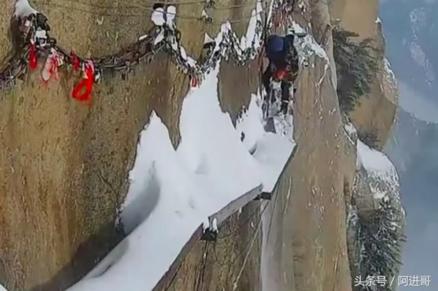 Employees clean snow on the cliff of Huashan Mountain, which enjoys the reputation as the “most perilous peak under heaven,” in Huayin City, northwest China’s Shaanxi Province.
