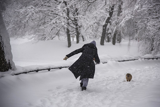 People walk next to a fallen branch due to heavy snowfall on a tree in the Botanical Garden in Moscow, Russia, Sunday, Feb. 4, 2018. (Photos: AP)