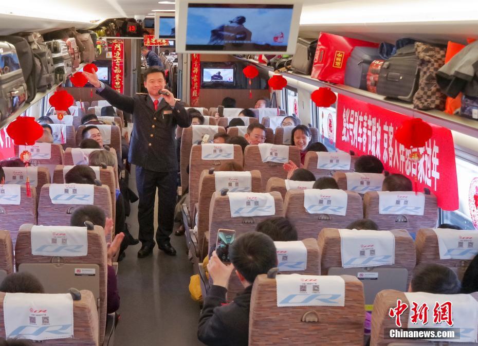 A party was held on Fuxing high-speed train heading to Shanghai from Beijing on Feb. 13 to celebrate the upcoming Chinese New Year. It was the maiden run for Fuxing locomotives in the annual Spring Festival travel rush.