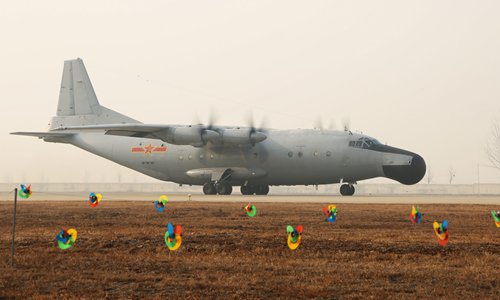 A Y-8 airborne surveillance aircraft attached to a Navy aviation regiment under the PLA Northern Theater Command taxies on the runway in a military airfield in Jiaodong Peninsula, east China’s Shandong province during an air patrol mission in the 2018 Spring Festival holiday.Photo:eng.chinamil.com.cn