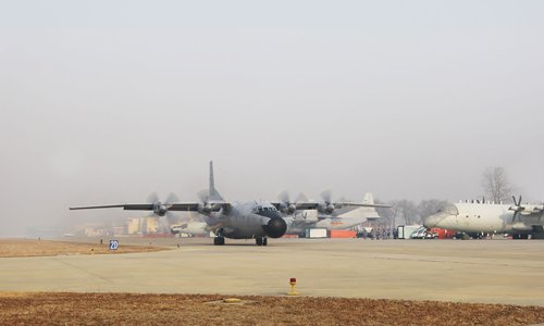 A Y-8 airborne surveillance aircraft attached to a Navy aviation regiment under the PLA Northern Theater Command taxies towards the runway in a military airfield in Jiaodong Peninsula, east China’s Shandong province during an air patrol mission in the 2018 Spring Festival holiday.Photo:eng.chinamil.com.cn