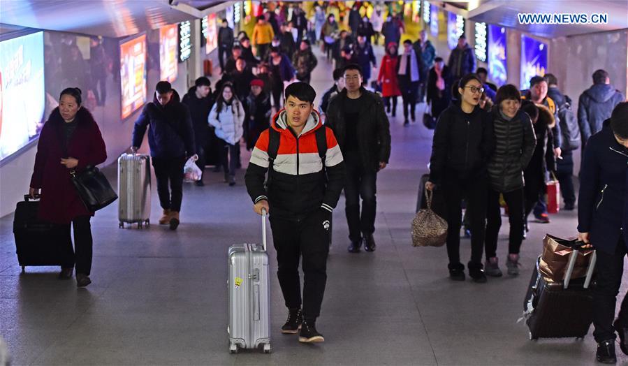Passengers walk out of the Shenyang North Railway Station in Shenyang, capital of northeast China's Liaoning Province, Feb. 21, 2018. On the last day of the Spring Festival holiday, China greets a travel peak for returning to workplace. (Xinhua/Yang Qing)