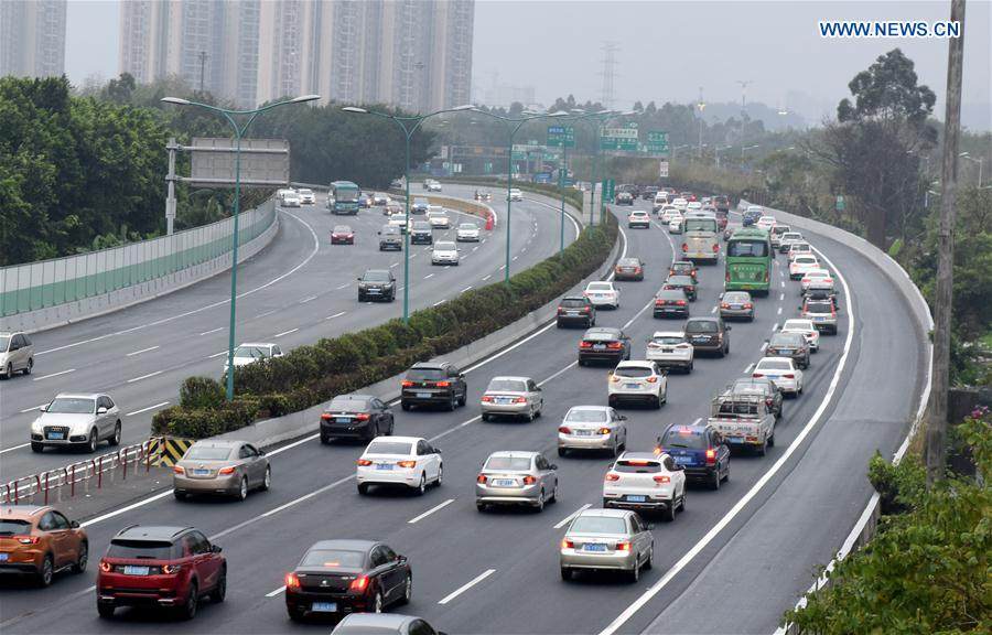 Cars run on a highway in Guangzhou, south China's Guangdong Province, Feb. 21, 2018. On the last day of the Spring Festival holiday, China greets a travel peak for returning to workplace. (Xinhua/Lu Hanxin)