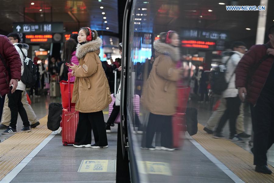 Passengers arrive at the Beijing South Railway Station in Beijing, capital of China, Feb. 21, 2018. On the last day of the Spring Festival holiday, China greets a travel peak for returning to workplace. (Xinhua/Xing Guangli)