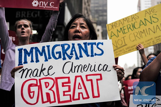 Photo taken on Oct. 5, 2017 shows protesters during a rally in support of DACA near the Trump Tower in New York. (Photo: Xinhua/AFP)