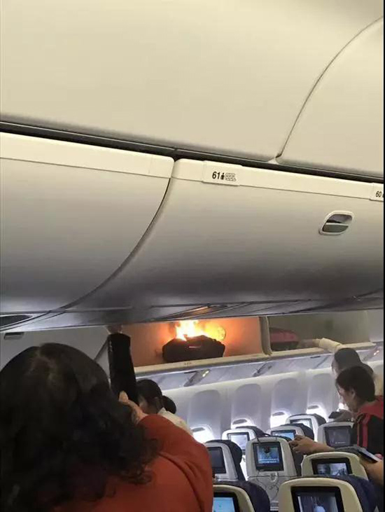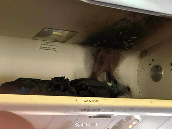 A fire ignited by a passenger's portable power supply inside the cabin of an airplane on Jan. 25 (Photos: Sina Weibo)