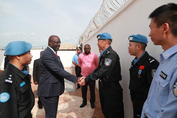 Liberian President George Weah (second from left) shakes hands with a member of the fifth Chinese peacekeeping police team in Monrovia, capital of Liberia. (Photo by Zhao Xiaoxin from People’s Daily)