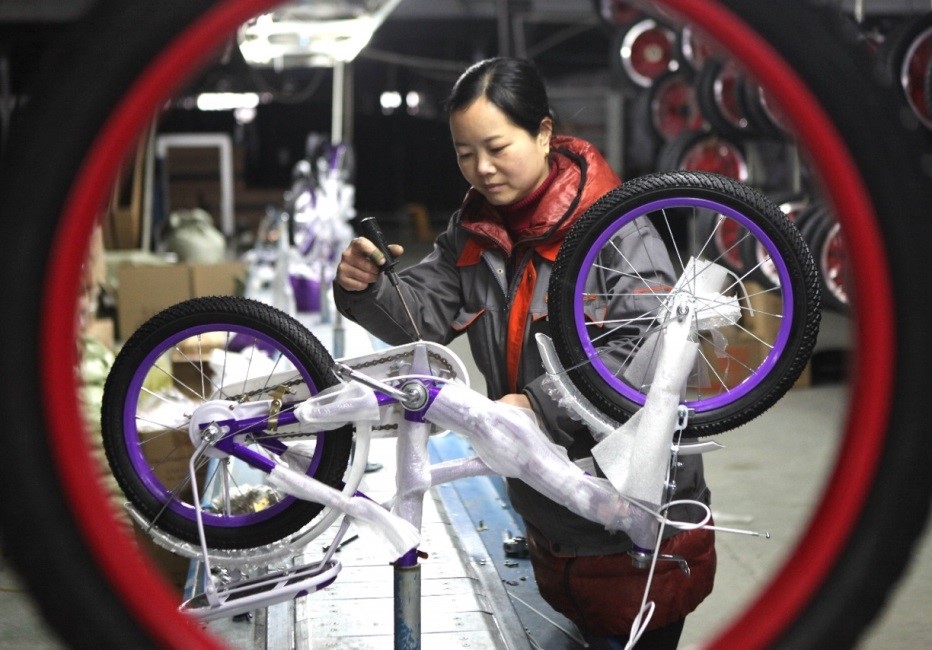 A worker is assembling a bike at a factory based in Quzhou county, north China’s Hebei province on Jan. 24, 2018. A total of 15 enterprises in the county have been granted the right to self-manage imports and exports. Their products have been sold to Africa, Southeast Asia and Europe. (Photo by Hu Gaolei from CFP)