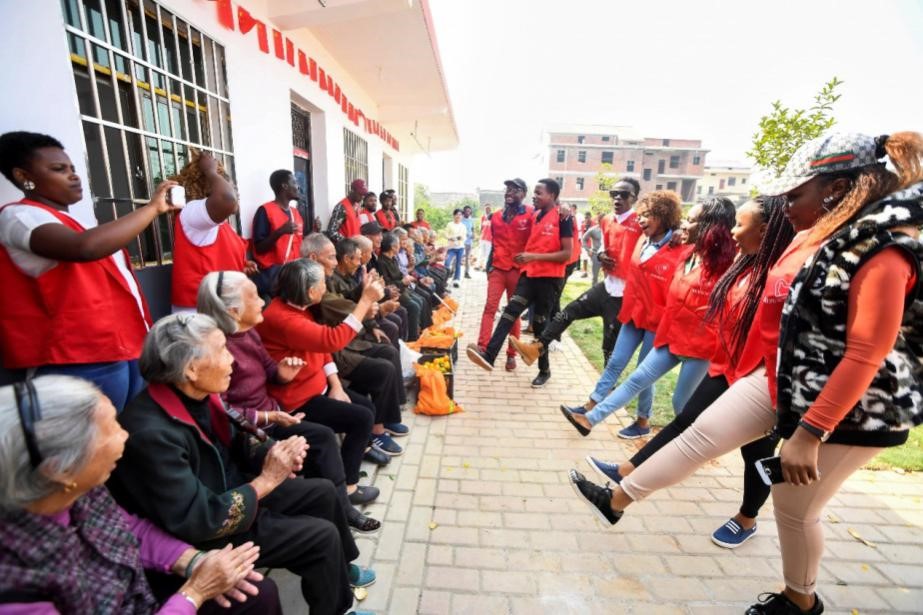 African students studying at Xinyu University, Jiangxi province dance for the elderly at a local nursing home, Oct. 28, 2017. (Photo by Zhou Liang from People’s Daily Online)