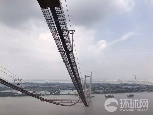 Photo shows the Humen Bridge II which is under construction. The Humen Bridge II, which spans 12.89 kilometers, is a world-class suspension bridge built in southern China’s Guangdong province. Scheduled to be completed in 2019, it links the western and eastern banks of the Pearl River. (Photo from Huanqiu.com)