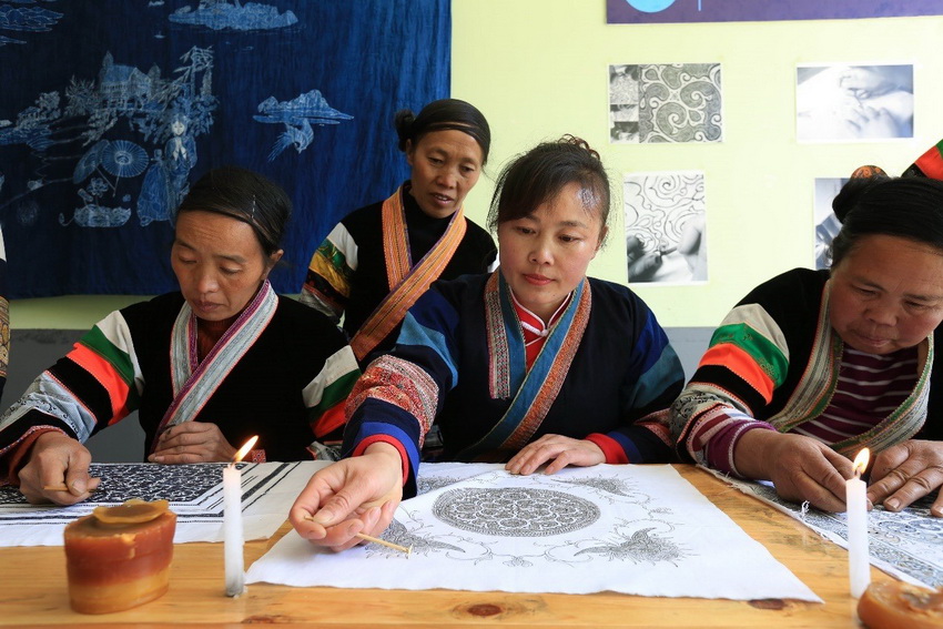 Yang Xiaozhen, a female provincial-level inheritor of wax printing, discusses the technique with fellow villagers in Zhijin County, southwest China’s Guizhou province, March 8, 2018. Following the national call for poverty reduction, Yang went back to her hometown in 2017 to pass on the technique to women farmers and helped them get rid of poverty. (Photo from CFP)