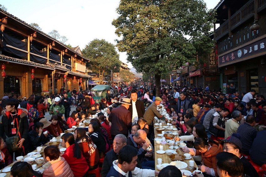 A long table banquet is held for tourists visiting a village of the Dong ethnic minority in Liping County, southwest China’s Guizhou province on March 9, 2018. Taking the advantage of the 93 traditional villages and ethnic cultural resources, the county strengthens rural tourism and makes it a new path for poverty reduction. (Photo by CFP)