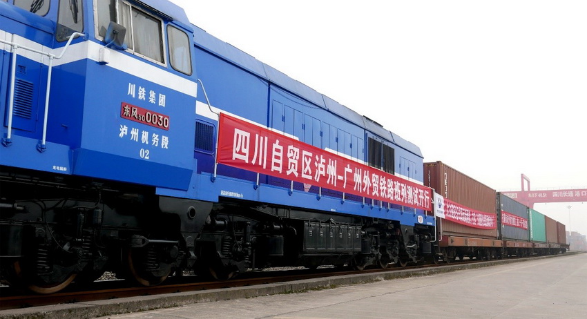 Test run of trains for foreign trade between Luzhou in southwest China’s Sichuan province and Guangzhou, capital city of south China’s Guangdong province is launched at the South Sichuan Port Area of China (Sichuan) Pilot Free Trade Zone, Dec. 21, 2017. (Photo from CFP)