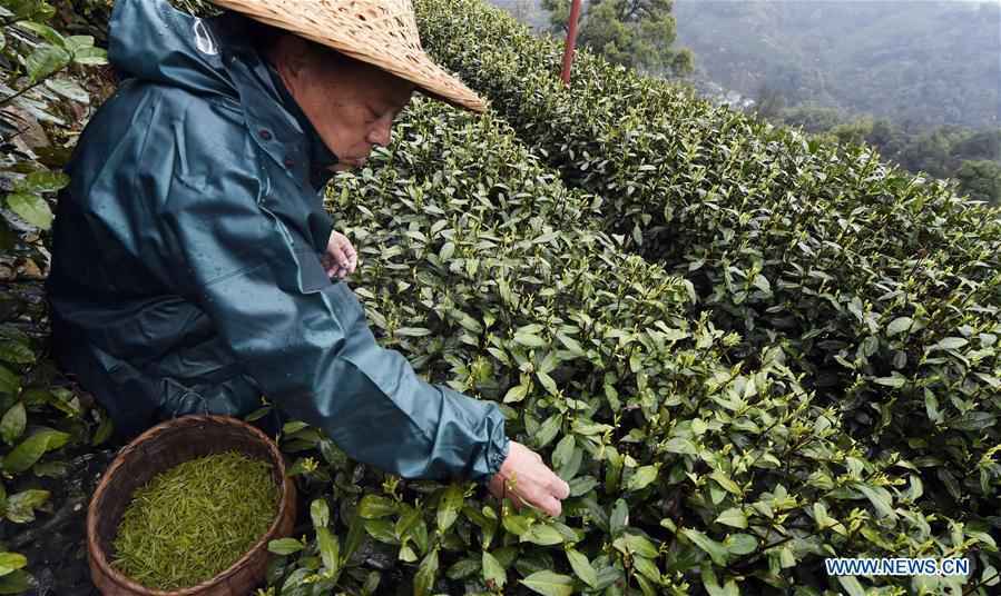 A farmer picks Longjing tea leaves in Hangzhou, east China's Zhejiang Province, March 16, 2018. Farmers in suburban Hangzhou have taken on this year's first harvests of the renowned Longjing tea, while harvests in greater scale are expected around March 20. (Xinhua/Li Zhong)