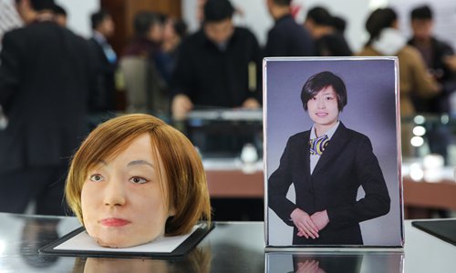 A 3D-printed head is displayed next to a photo of an employee at the Babaoshan funeral parlor in Beijing. Photo: VCG