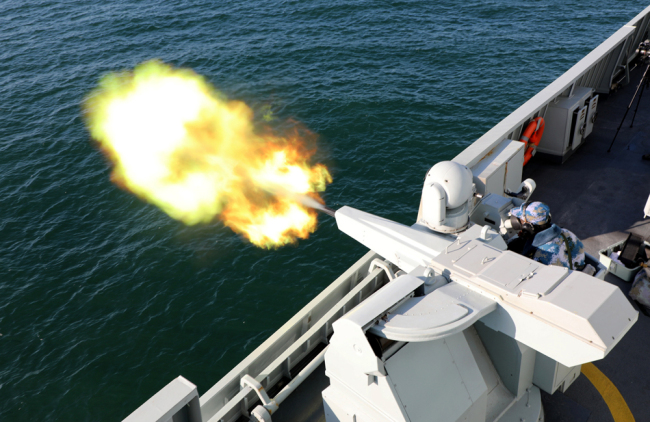 The guided-missile frigate Fushun (Hull 591) attached to a frigate flotilla of the navy under the PLA Northern Theater Command fires its close-in weapons system during a 6-day maritime realistic training exercise at an undisclosed sea area from March 5 to 10, 2018. [File Photo: chinamil.com.cn/Huang Liang]