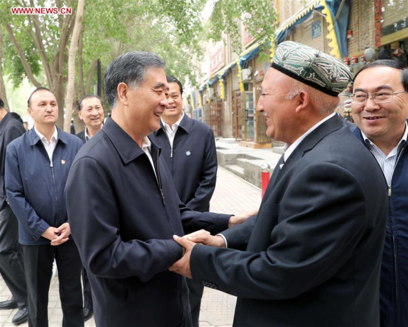 Wang Yang, chairman of the National Committee of Chinese People's Political Consultative Conference, also a member of the Standing Committee of the Political Bureau of the Communist Party of China Central Committee, visits a mosque in Hotan City, northwest China's Xinjiang Uygur Autonomous Region, April 10, 2018. Wang made an inspection tour in Xinjiang from April 10 to 14. (Xinhua/Liu Weibing)
