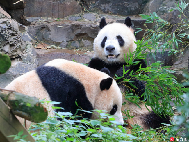Two giant pandas eat bamboo at the Hangzhou Zoo in Hangzhou, Zhejiang province, September 11, 2017. [File Photo: IC]